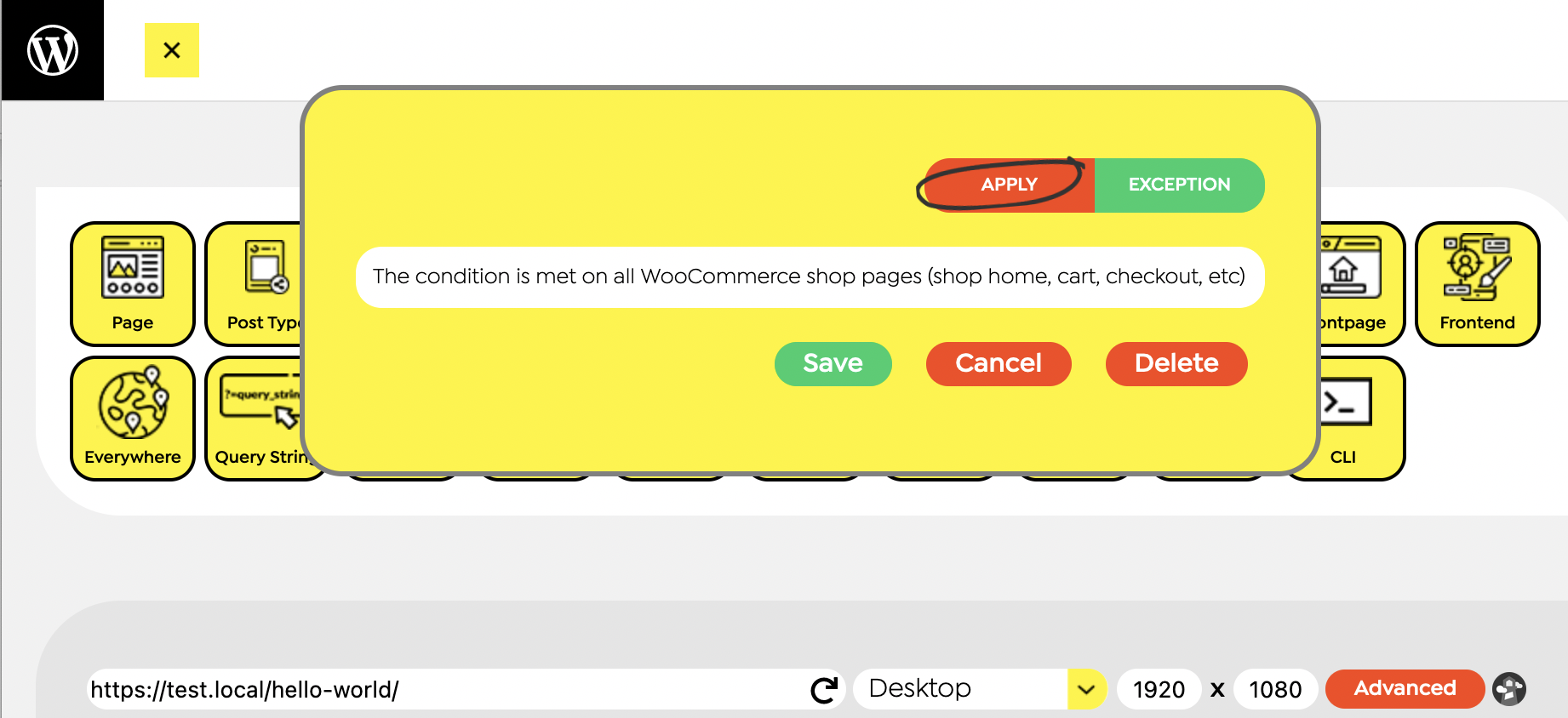 WP Shifty will detect if WooCommerce is active on your site. If WooCommerce has been detected, you can add Shop Page condition. This condition is met on all WooCommerce shop pages (shop home, cart, checkout, etc.)